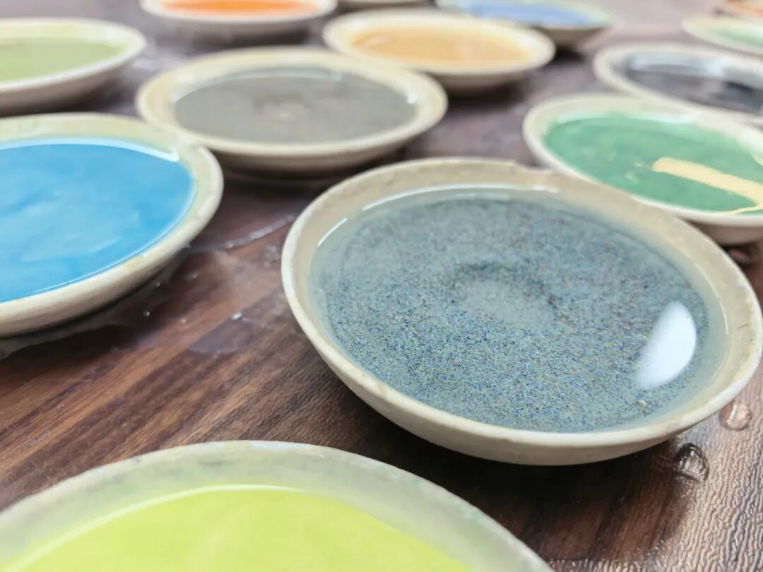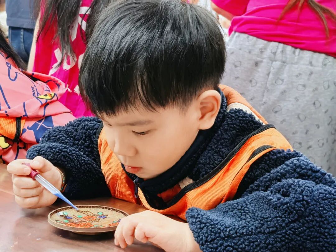 在专业技师的指导下,孩子们围坐在工作台前,面前摆放着已经掐好丝的铜胎、色彩斑斓的釉料以及特制的点蓝工具。技师耐心示范如何用吸管吸取釉料,再精准地点涂在铜丝勾勒出的图案内。孩子们纷纷拿起工具,小心翼翼地尝试。有的专注地为 “花朵” 填上艳丽的色彩,有的精心为 “枝叶” 点缀深浅不一的绿色,还有的大胆发挥创意,调配出独特的颜色组合。随着一个个铜胎逐渐被缤纷的釉料填满,孩子们的脸上也绽放出了自豪的笑容,真切感受到了非遗技艺的魅力与不易。