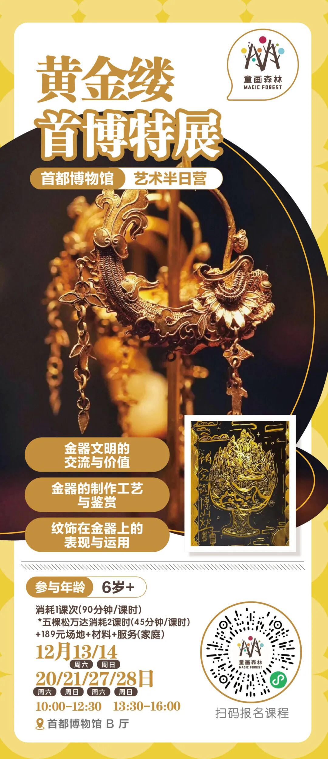 踏入首都博物馆,开启一场金光闪闪的探秘之旅!“黄金缕”特展汇聚了历代精美金器,我们将带领孩子近距离观察这些巧夺天工的珍宝。课程不仅讲解黄金的冶炼、锤揲、錾刻等制作工艺,更会引导孩子们学习如何鉴赏金器纹样背后的寓意与时代审美,读懂其中蕴含的历史信息与奢华之美,培养细致的观察力与审美情趣。