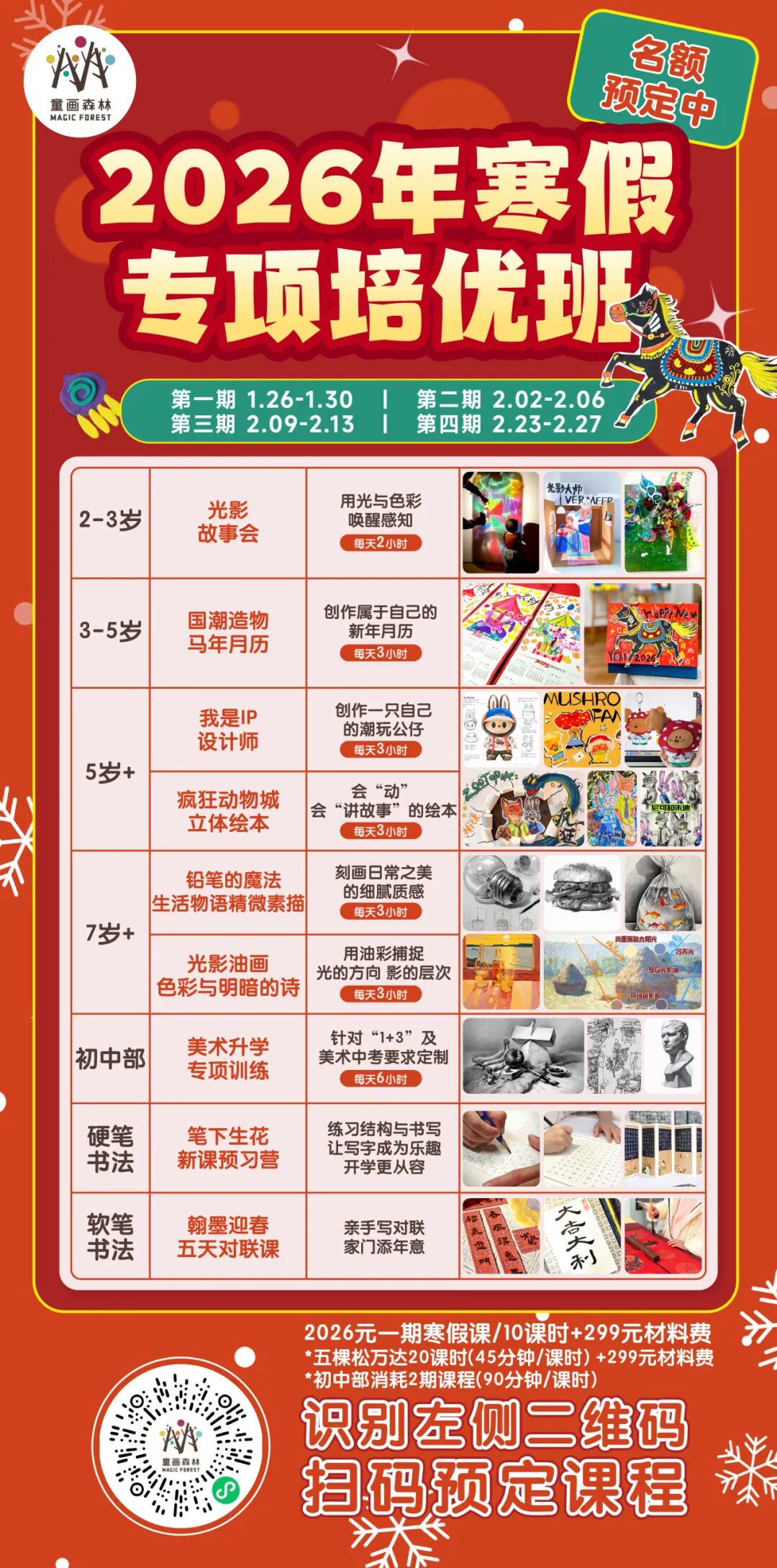 寒假课程表新鲜出炉!这个冬天,童画森林为孩子们准备了丰富主题的艺术创作、科学实验和户外探索,让假期充满笑声与创意。现在报名享特别优惠,一起解锁宝贝的快乐冬日时光吧!